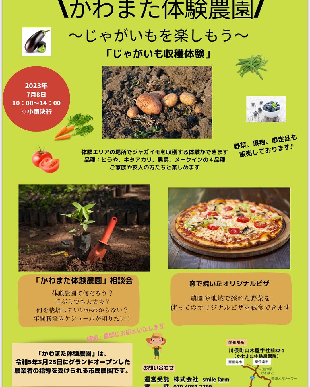 7月8日土曜日☀️かわまた体験農園でジャガイモ収穫祭🥔やってます☺️&窯で焼いたピザも大盤振る舞いです☺️他にも新鮮野菜なども販売してますので、ふらっと気軽に10時〜14時までやってます♪是非是非、お待ちしております😊